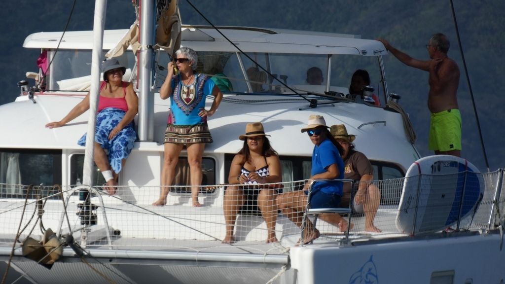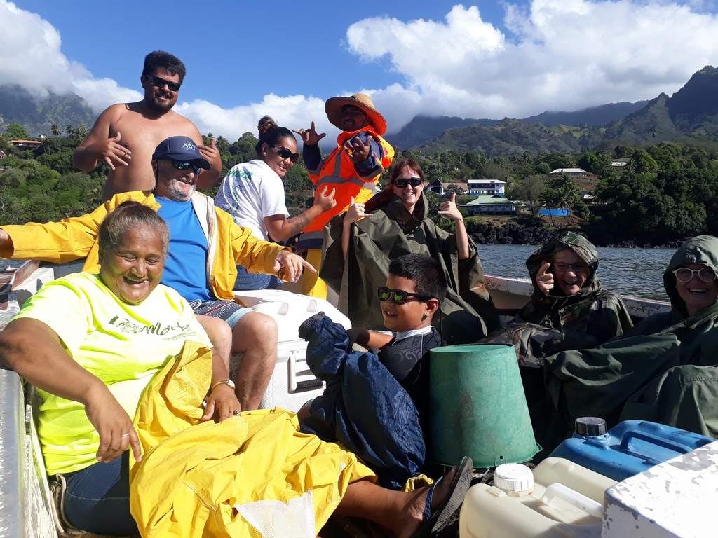 on emmène 25 villageois sur une plage inaccessible par la piste ; il n’y a pas de plage de sable blanc à Hapatoni, alors c’est une belle excursion ; départ 7 H, on va les chercher en annexe et on les embarque ; c’est parti pour une heure de navigation ; une magnifique raie manta nous ouvre la route, les yukulélés et les danseuses sur Alaïa rassurent tout le monde. Voir le film