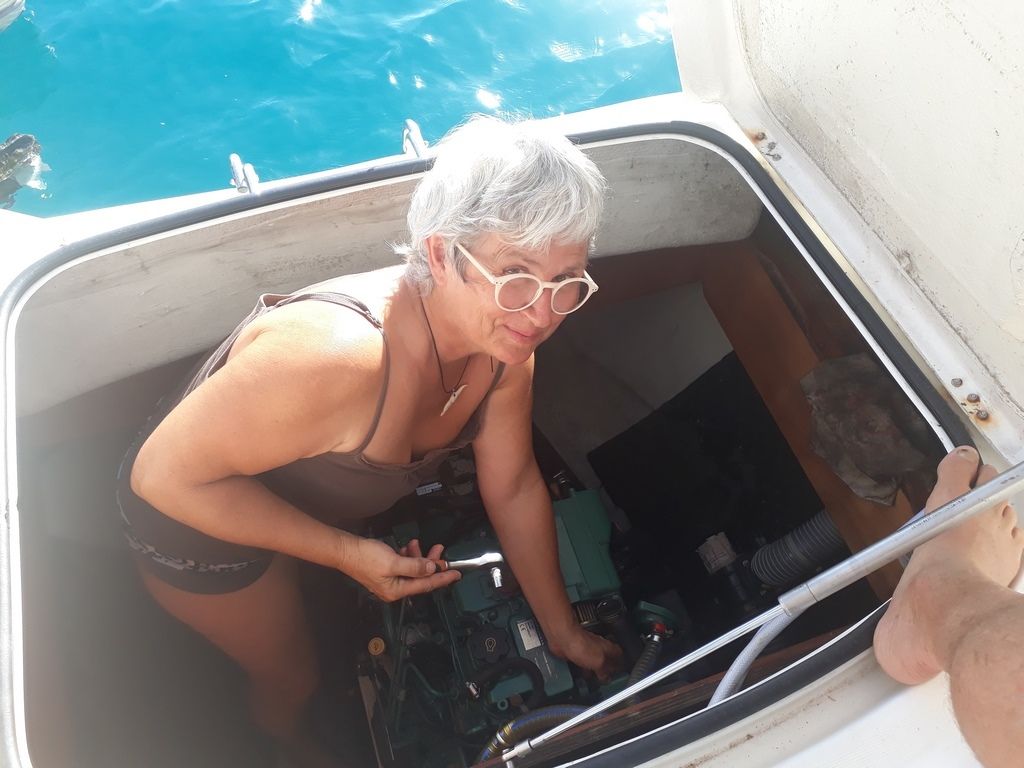 Je me sens épuisée, inefficace. ; Alain passe une semaine coincé dans le moteur dans la jupe arrière du voilier, qui fait 1M/1M sous une bâche de Bédouin ,