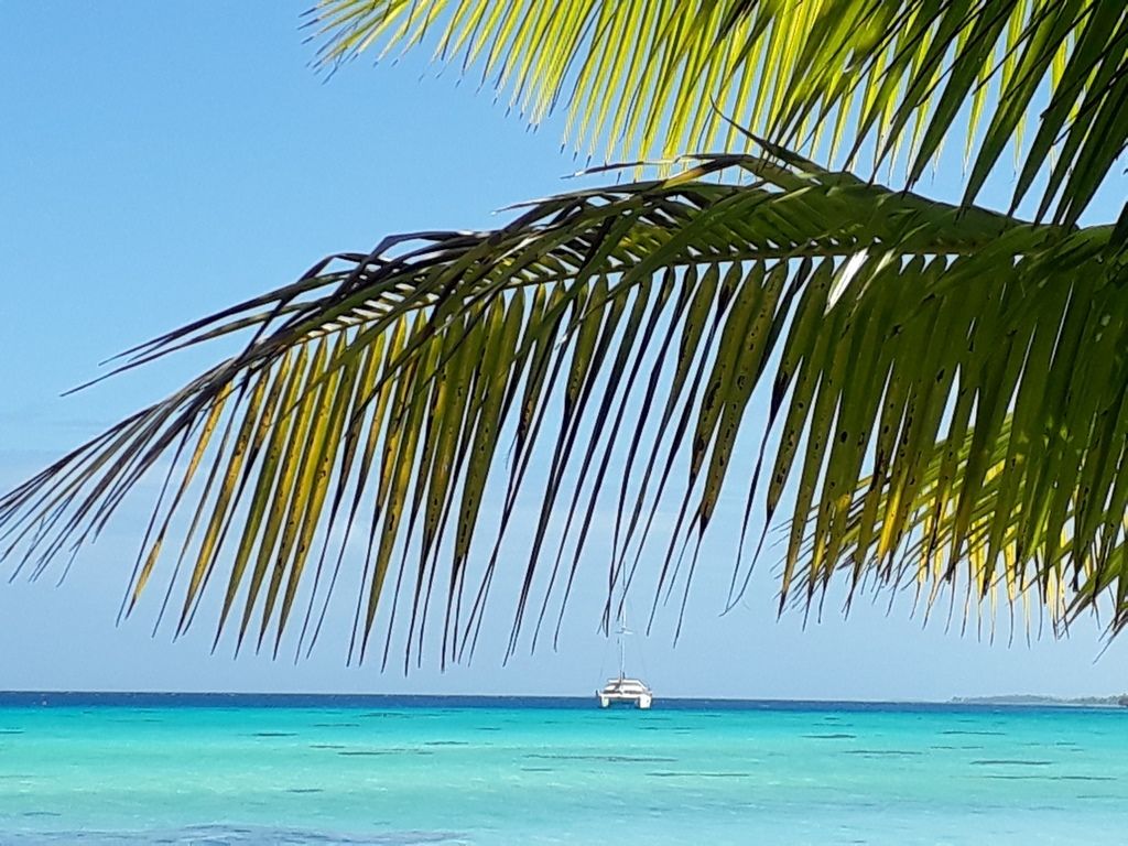Et là, à 200 m de la plage, un calme divin, aucun mouvement du bateau quelques lumières au loin sur la barrière, le clapot de l’annexe à l’arrière, le ciel étoilé, la douceur de la nuit... Et on se dit : incroyable d’être dans une zone aussi inconnue, sur l’eau et de se sentir autant en paix et en sécurité... La magie de la mer immobile qui rassure au lendemain des tempêtes. La sérénité totale...Elle est bleue turquoise, les cocotiers se penchent tendrement vers elle, c’est beau…