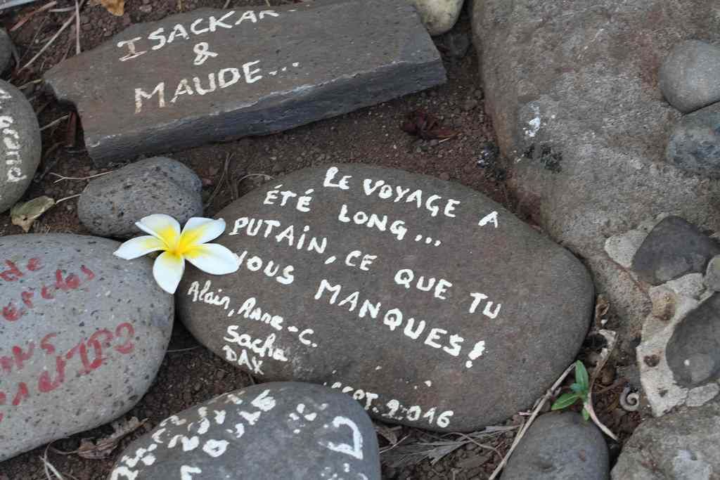 Autour du Mae principal, les discours officiels en Marquisien et présentation des écoles sont aussi le moment pour nous de partager le KAI KAI ( repas) local avec d’autres voyageurs et de nous régaler de la diversité des styles ; cette famille a tout laissé en Europe, et largué les amarres avec 3 enfants qui portent des tee-shirts « I LOVE JESUS » et vouvoient leurs parents qui regrettent que Jacques Brel n’ait pas une croix sur sa tombe !!