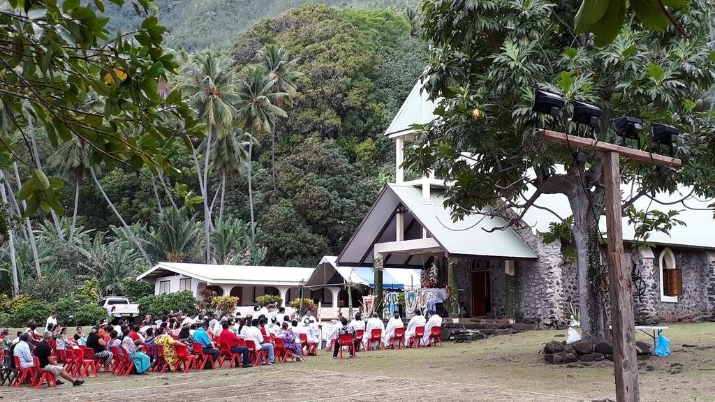 Après remontage de l’échangeur enfin arrivé de France, et une dernière noria en annexe pour faire le plein de gasoil avec les bidons, retour à Hapatoni pour une nouvelle fête religieuse, avec messe en plein air
