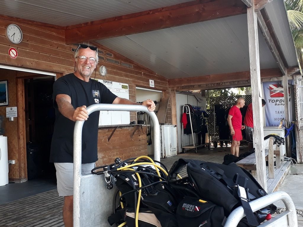et 1 thon et 2 heures à tourner devant la passe de Tiputa pour ne pas se faire avoir une deuxième fois ! Nous voilà ancrés devant le centre de plongée de Top dive ou Alain encadre les plongées une semaine.