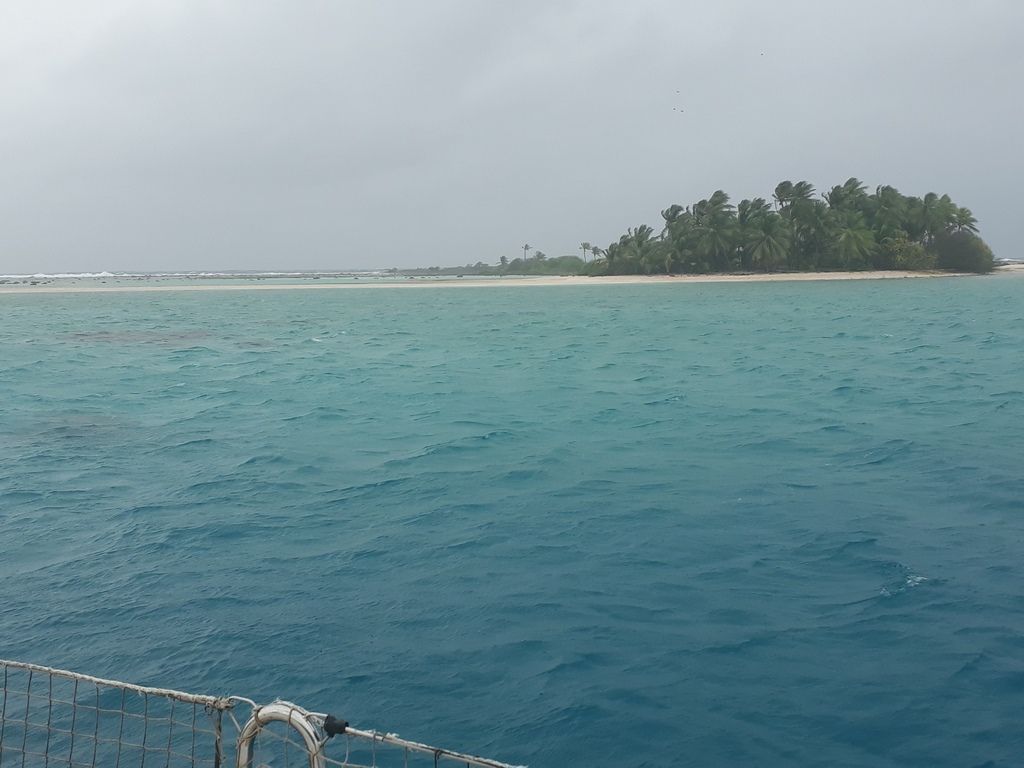 c’est trop instable retour au code 0 on prend des ris et on le met en ciseaux, on adapte. Il faut essayer d’arriver avant la renverse du courant pour rentrer dans l’atoll et c’est excitant de sentir le bateau bien réglé glisser sur l’eau