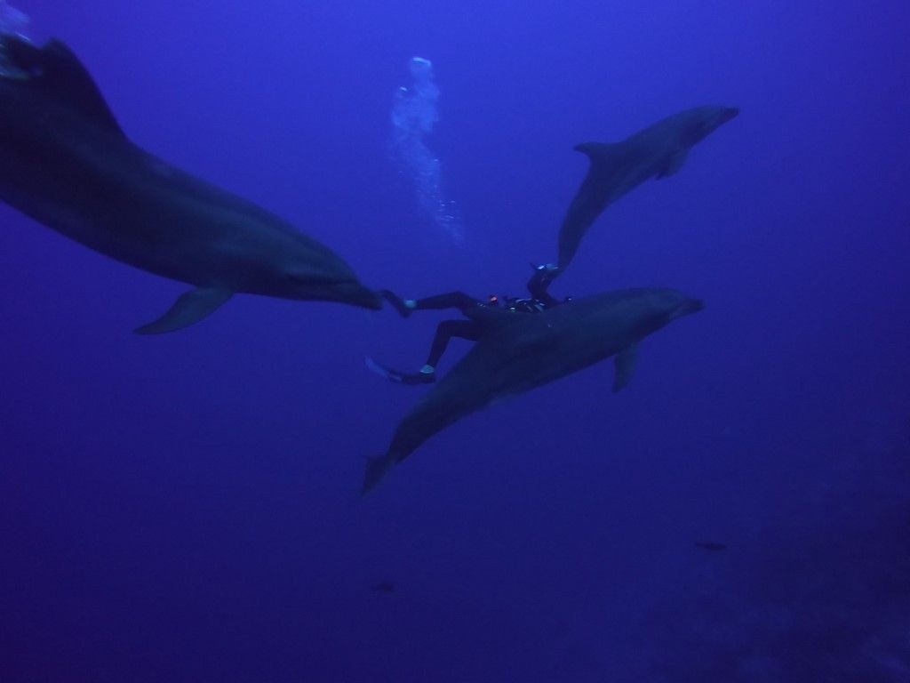 La passe de Tiputa est célèbre. Les dauphins y sont amicaux, ils jouent dans les vagues du mascaret et viennent de temps en temps saluer les plongeurs. Parfois ils viennent même se faire caresser ou gratouiller sous les nageoires et sur la caudale ; moment magique ! mais c’est à leur discrétion… Ce sont des animaux sauvages et ce sont eux qui décident ; certains moniteurs, en particulier les Polynésiens qui sont nés ici, semblent avoir leur préférence (n’est-ce pas Manou… une belle histoire d’amour !). Il est sûr que l’interaction plongeurs dauphins a modifié leur comportement, mais ils semblent libres de choisir ;