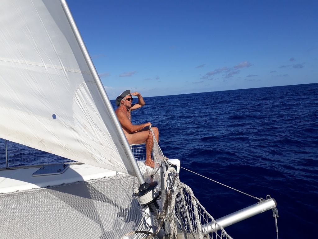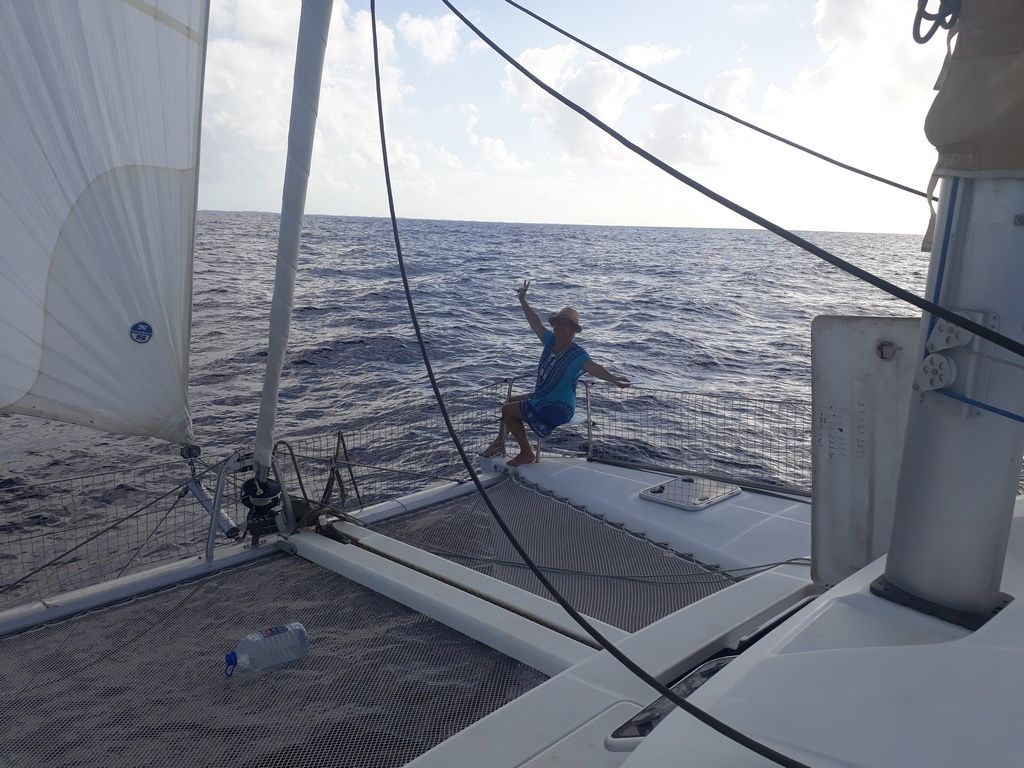 J’admire mon équipière préférée, car effectivement c’était impressionnant de voir comment le bateau tirait sur ses 50 mètres de chaîne et quand on mettait le nez dehors, c’était pas jojo. Il n’y a que la raison et la certitude d’avoir mis en place ce qu’il fallait qui permet de rester zen ; on a finalement traversé ce coup de maramu au bon endroit et globalement plutôt sereinement.
