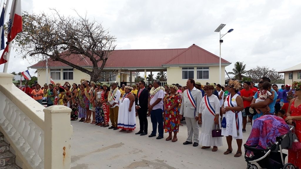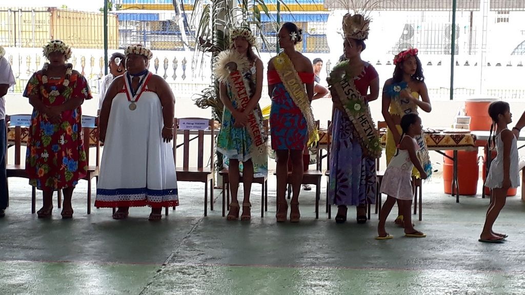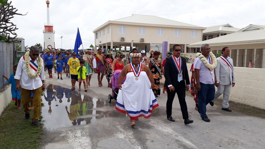 : les élus avec leurs écharpes tricolores, les miss de toutes les éditions précédentes, les délégations des 4 atolls ; un joyeux mélange qui va défiler sur 200 mètres jusqu’à la mairie pour les lever des couleurs Française et Polynésienne au son de la marseillaise et de l’hymne polynésien… Mon premier défilé du 14 juillet !