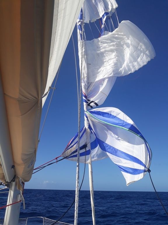 Un autre voilier est à 3 milles pendant 2 jours, en route parallèle, on finit par avoir de la sympathie, on ne les connait pas mais on les observe… C’est si rare un voilier sur ces trajets ; tiens il a mis son spi, nous on choisit le cocotier