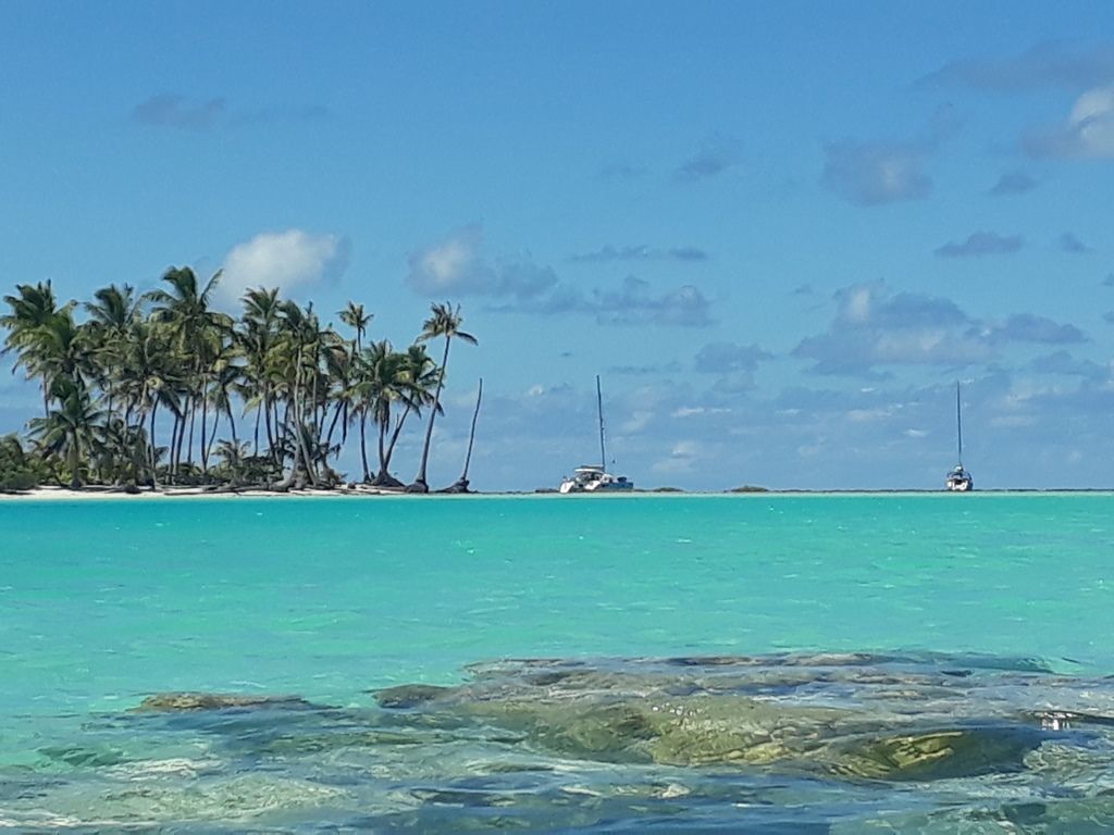 Là où on a mis l’ancre, la mer est calme car on est a l’abri des 10 palmiers de ce minuscule motu et de la barrière de corail, magique non ? Il faut juste se persuader que le mouillage va tenir et que les vagues ne peuvent pas rentrer dans le lagon ! A 100m, de l’autre côté du platier, nous les voyons s’exploser sur le corail.
