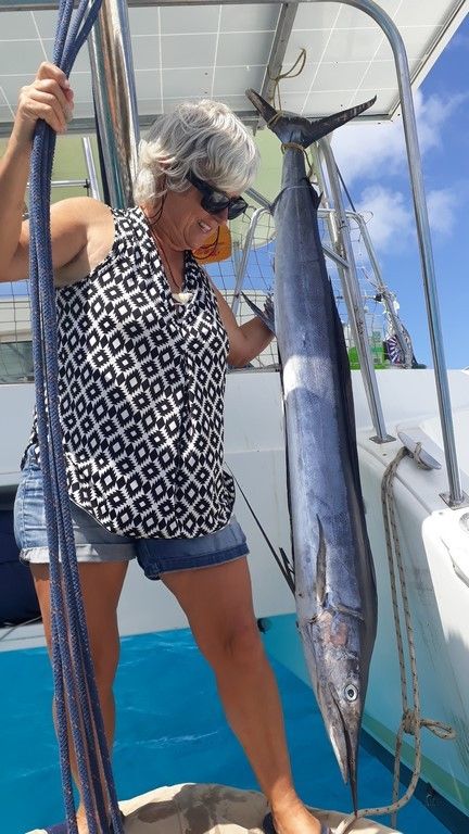 avec Elisabeth et Serge qui nous font visiter leur Outremer 51 ; magnifique ; ils naviguent depuis 2 ans, ils ont tout vendu pour partir ; Notre beau catamaran nous semble tout petit après cette visite ; la loi de la relativité, vite allons voir un plus petit que nous ! mais pas de problème, il est parfaitement adapté à notre besoin en navigation et confort.