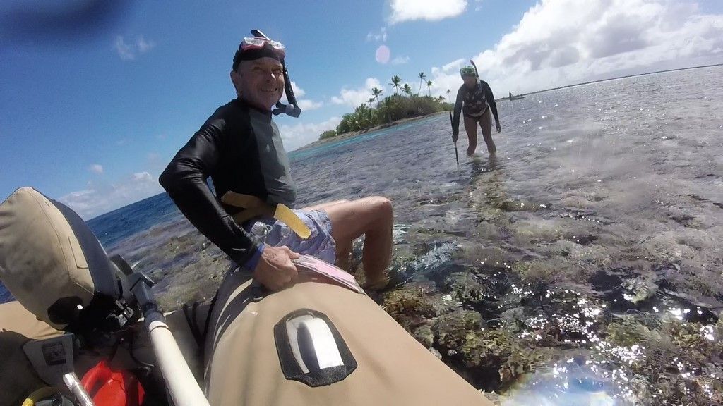A un moment, Peter lâche son annexe quelques secondes pour une apnée ; elle part sur le platier au milieu d’un Hoa où il est impossible de marcher pied-nus ni nager, du fait des coraux coupants à fleur d’eau ! heureusement nous avons des chaussures dans notre bateau ; je pars à pied la chercher à 200m et Myriam récupère nos amis, les pieds, genoux et mains déjà bien coupés.